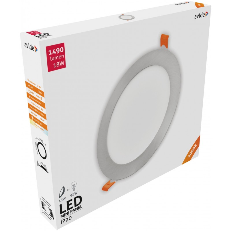 Kulatý zápustný panel s LED páskem po boku, ultratenký design, nestmívatelný zdroj a sada pružinek součástí balení.