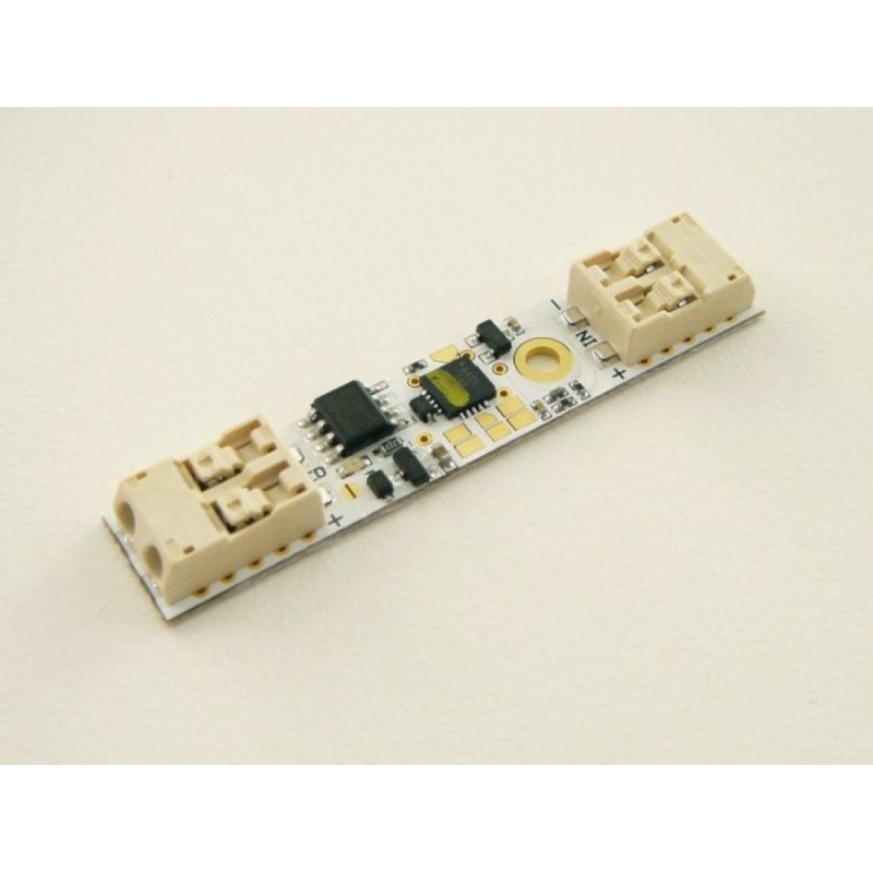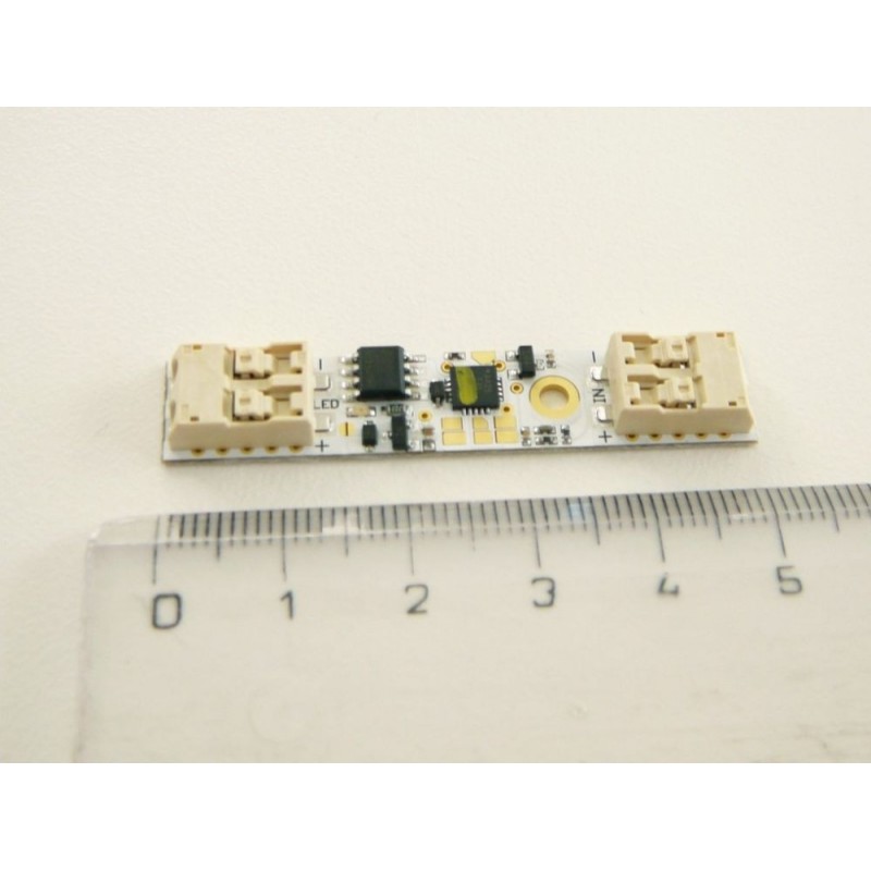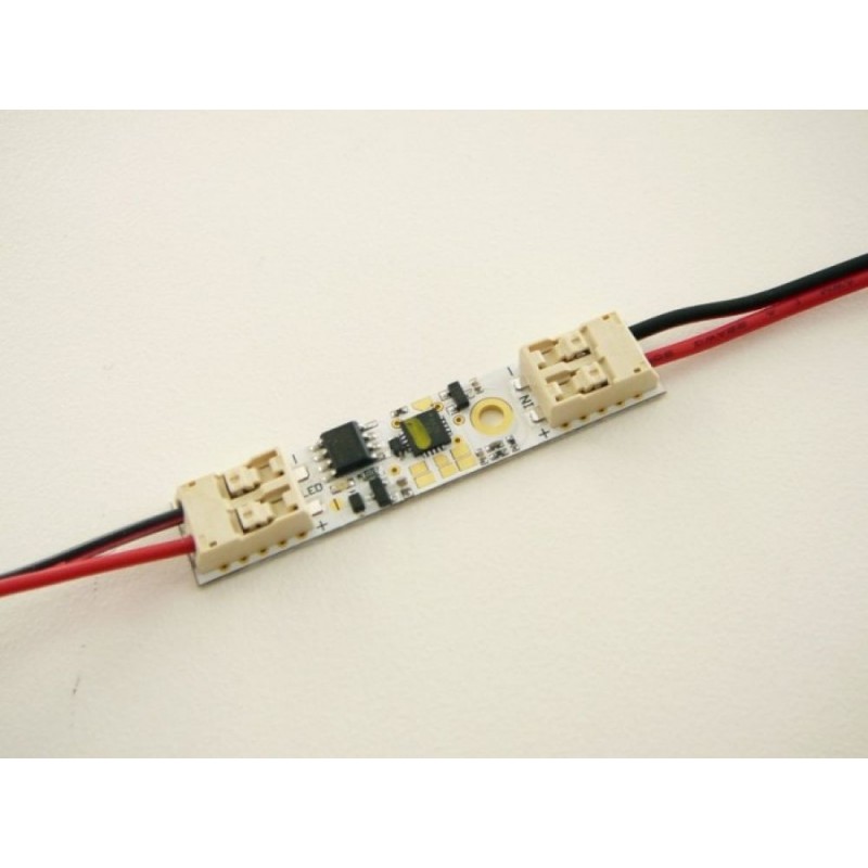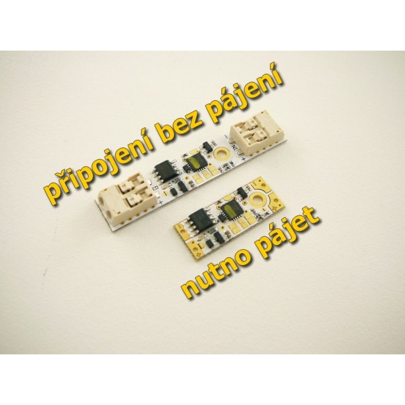 Miniaturní stmívač/spínač určený k vestavění do ALU profilů s LED pásky, kde profil slouží zároveň jako dotykový senzor. Zapnutí LED pásku se ovládá dotykem profilu, pro stmívání se profil drží. Funkce postupného náběhu světla šetří oči, po přerušení napájení si pamatuje poslední nastavenou úroveň osvětlení.