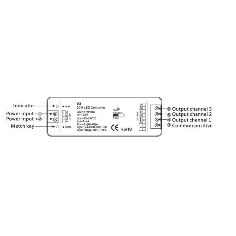 Radiofrekvenční přijímač stmívač pro RGB LED produkty. Přijímač může být ukrytý (za zdí, sádrokartónem či ve skříni), není nutná přímá viditelnost přijímače pro ovladač.