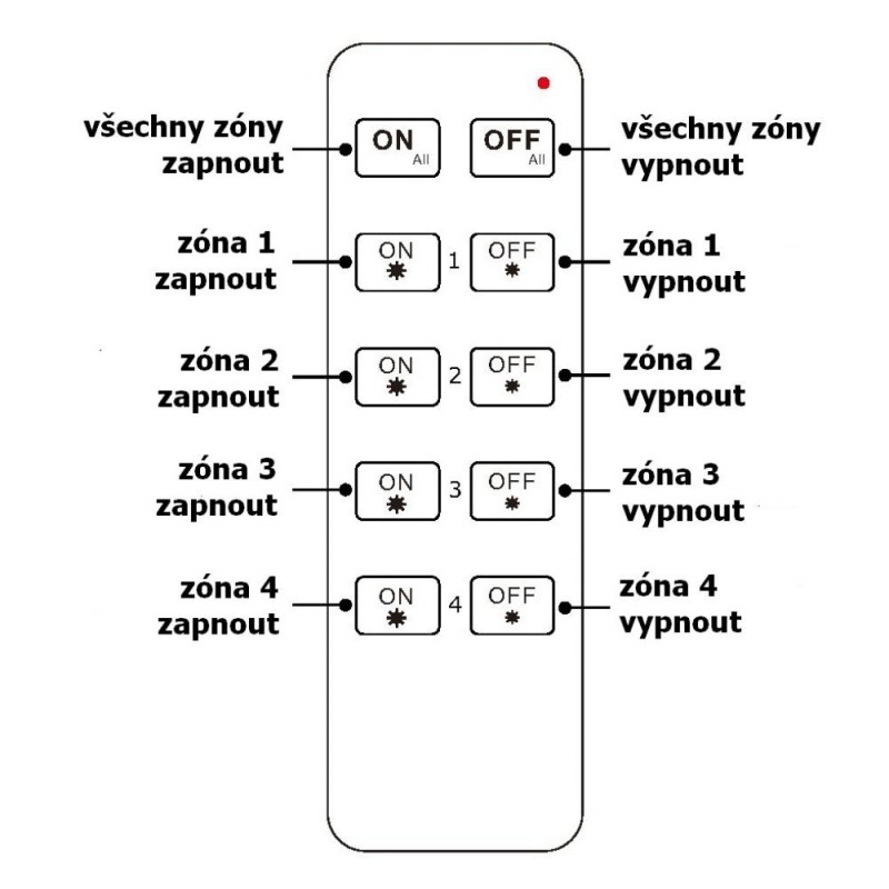 Dálkový ovladač dimLED OV 4KL je bezdrátový radiofrekvenční ovládací systém, jednoho ovladače a několik přijímačů. S jedním ovladačem lze ovládat nezávisle 4 zóny, která se může skládat z několika přijímačů. Tyto přijímače se po sehrání na jednotlvé předvolbě na ovladači ovládají jako jedna sekce.