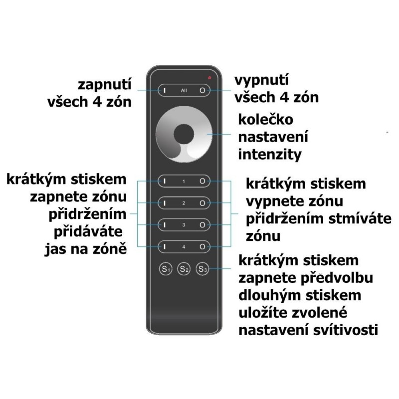 Dálkový ovladač dimLED OV 4KEXL je bezdrátový radiofrekvenční ovládací systém, jednoho ovladače a několik přijímačů. S jedním ovladačem lze ovládat nezávisle 4 zóny, která se může skládat z několika přijímačů. Tyto přijímače se po sehrání na jednotlivé předvolbě na ovladači ovládají jako jedna sekce.
