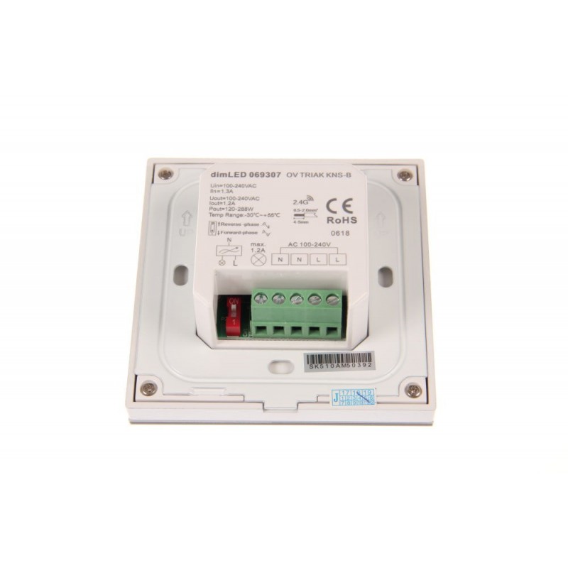 Nástěnný triakový LED stmívač dimLED KNS kombinuje vlastnosti přijímače a ovladače. S jedním ovladačem KNS lze ovládat 1 okruh, který se může skládat i z několika přijímačů na více místech. Zároveň lze přímo na výstup stmívače KNS připojit LED osvětlení a ovladač KNS použít i jako přijímač. Ovladačem KNS lze tedy ovládat i jiné řady přijímačů dimLED a zároveň k němu lze spárovat jiné modely ovladačů dimLED.