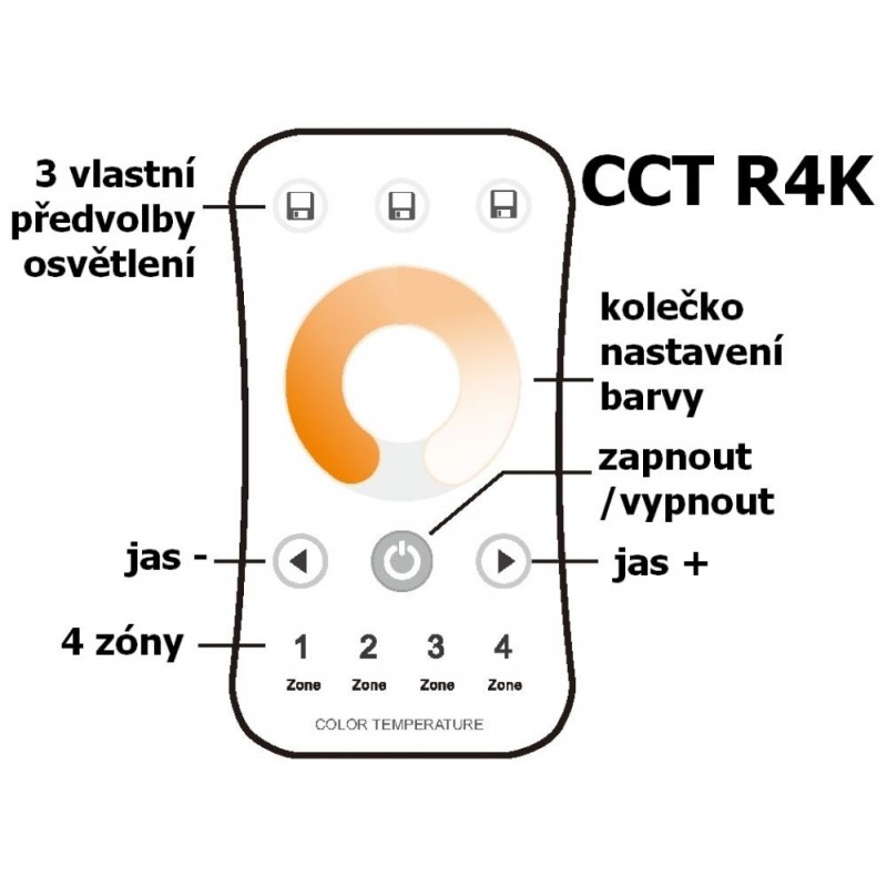 LED dálkový ovladač čtyřkanálový CCT R4K, dálkové RF (radiofrekvenční) ovládání, nový design a funkce