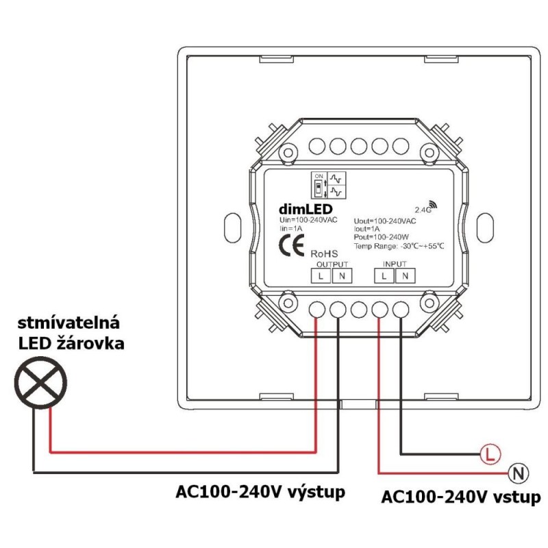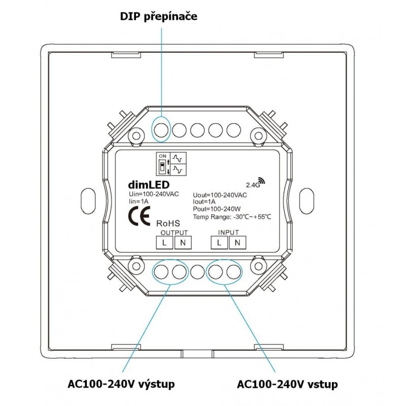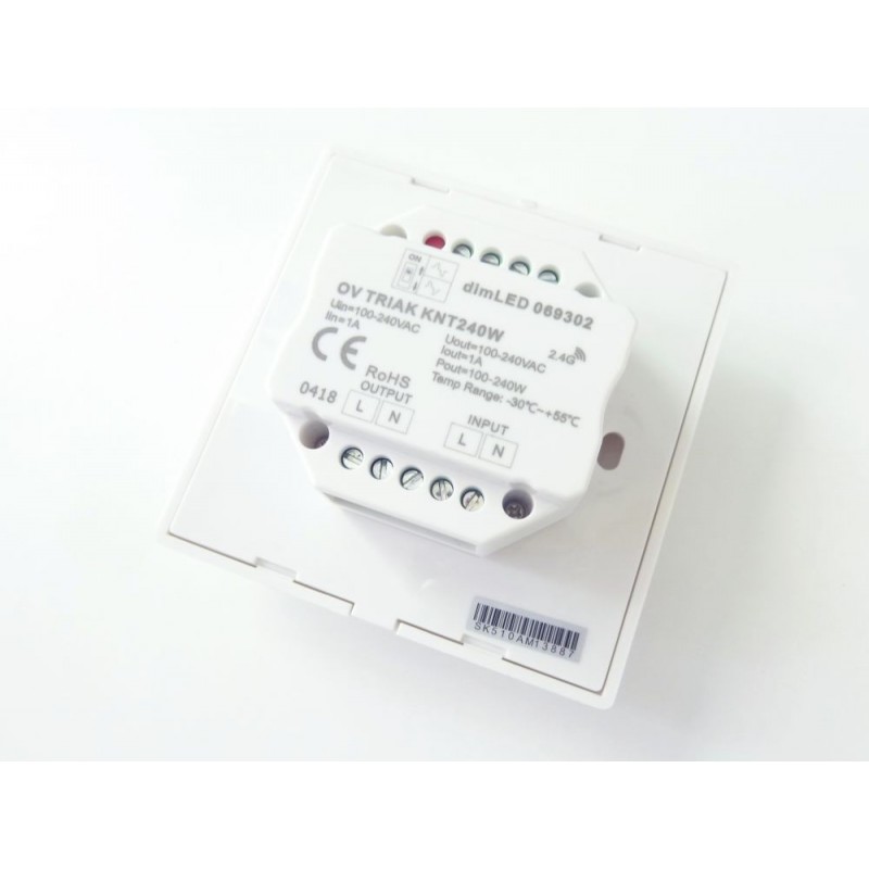 Nástěnný triakový LED stmívač dimLED KNT240W kombinuje vlastnosti přijímače a ovladače. S jedním ovladačem KNT240W lze ovládat 1 okruh, který se může skládat i z několika přijímačů na více místech. Zároveň lze přímo na výstup stmívače KNT240W připojit LED osvětlení a ovladač KNT240W použít i jako přijímač. Ovladačem KNT240W lze tedy ovládat i jiné řady přijímačů dimLED a zároveň k němu lze spárovat jiné modely ovladačů dimLED.