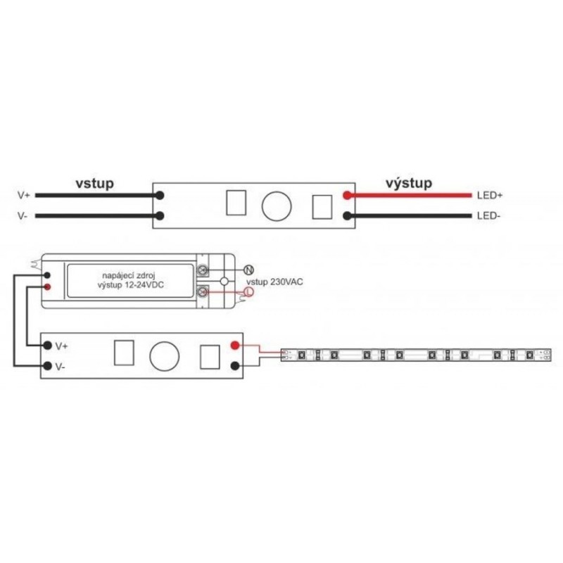Vysoce spolehlivý LED ovladač / stmívač do hliníkových profilů. Ovladač je určen pro přímou instalaci mezi přívodní kabel a LED pásek. Díky šířce pouze 10mm se vleze do většiny hliníkových profilů a je možno ho tedy instalovat do profilu přímo s LED páskem.