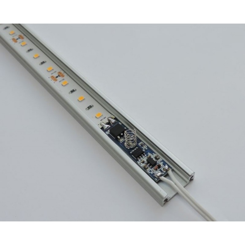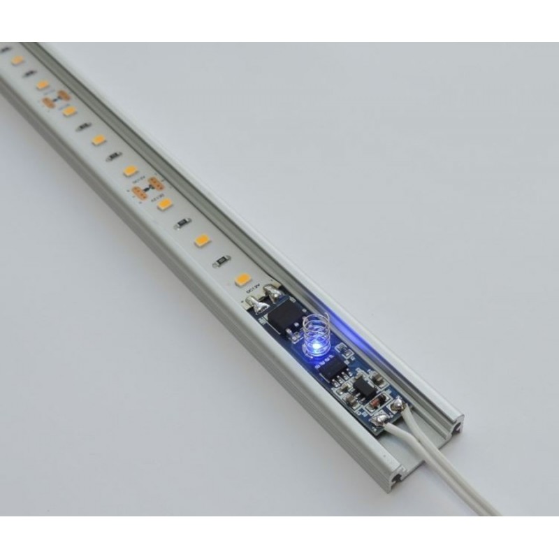 LED ovladač - stmívač pro hliníkové profily. Umožňuje ovládání LED pásku dotykem ruky v místě instalace ovladače. Krátkým dotykem ovladač vypíná a zapíná. Přidržením ovladač aktivuje režim stmívání LED pásku v rozmezí 10-100%. Po vypnutí ovladače si pamatuje poslední nastavenou intenzitu. Paměť si zachová i po odpojení napájení.