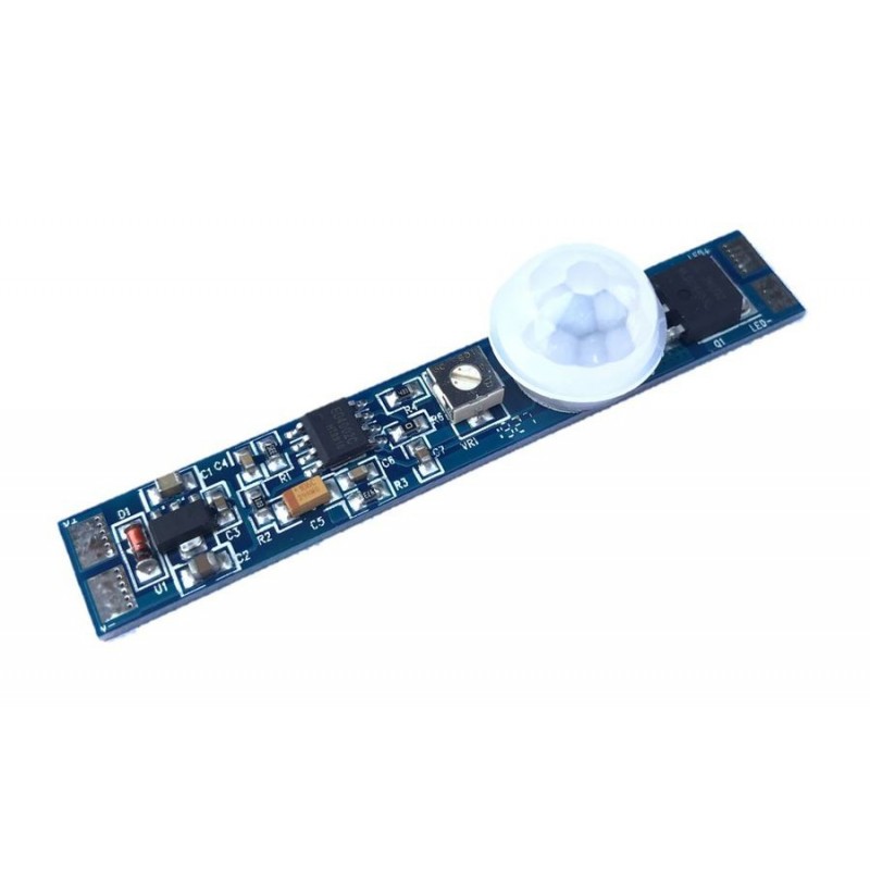 Miniaturní pohybový senzor technologie PIR pro LED pásky do ALU profilů. Senzor má možnost nastavení času sepnutí od 6 do 70 vteřin. PIR sensor je montovaný přímo na nosiči a je nutné vyvrtat otvor skrz difuzor, hloubka mezi vrchem difuzoru a profilem může být max. 6mm. Dosah senzoru je cca 2m. Maximální zatížení je 2A. Vyšší zatížení teplotně ovlivňuje PIR senzor a může vyvolávat falešné sepnutí. Sensor musí být umístěn viditelně.