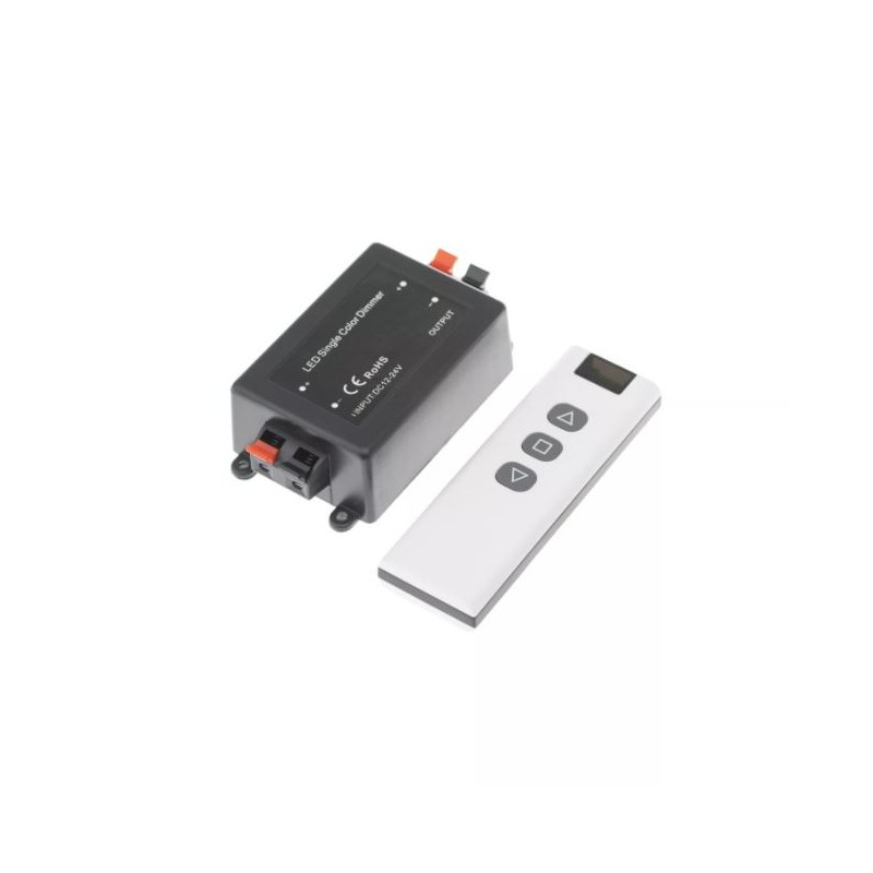 Stmívač a vypínač jednokanálový RF - radiofrekvenční dálkové ovládání intensity jasu LED pásků, stmívatelných LED žárovek 12V a jednobarevných modulů.