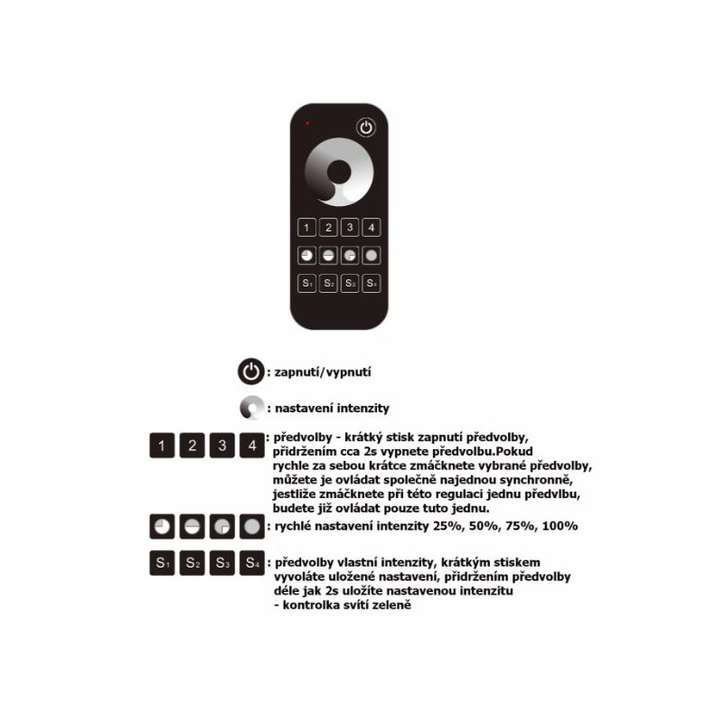Dálkový ovladač dimLED OVM 4KRM je bezdrátový radiofrekvenční ovládací systém, jednoho ovladače a několik přijímačů. S jedním ovladačem lze ovládat až 4 zóny, které se mohou skládat z několika přijímačů. Tyto přijímače se po sehrání s ovladačem v jedné zóně ovládají jako jedna sekce.