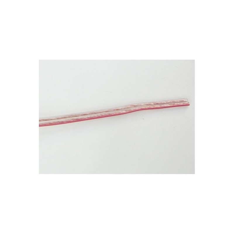 Dvoužilový plochý vodič s laněným měděným jádrem. Izolace je z transparentního PVC a jedna z žil je označena červeným pruhem.