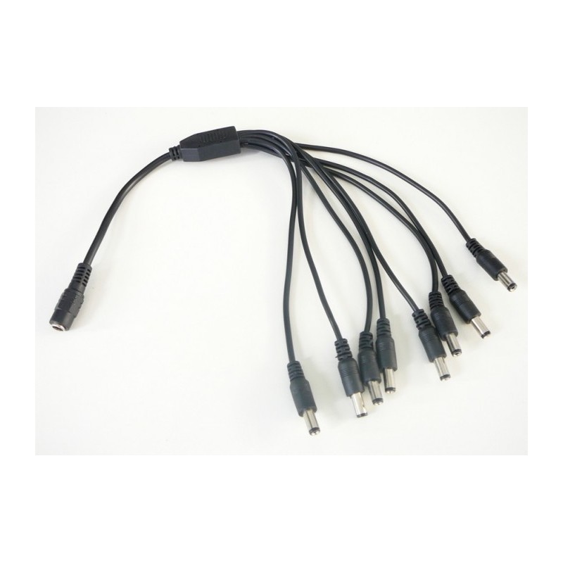 DC rozbočovač s 8 výstupy. Rozměr 2,1/5,5mm. Délka 40cm. Maximální zatížení 5A na vstupu, 1A na jednotlivých výstupech rozbočovače.