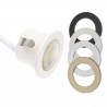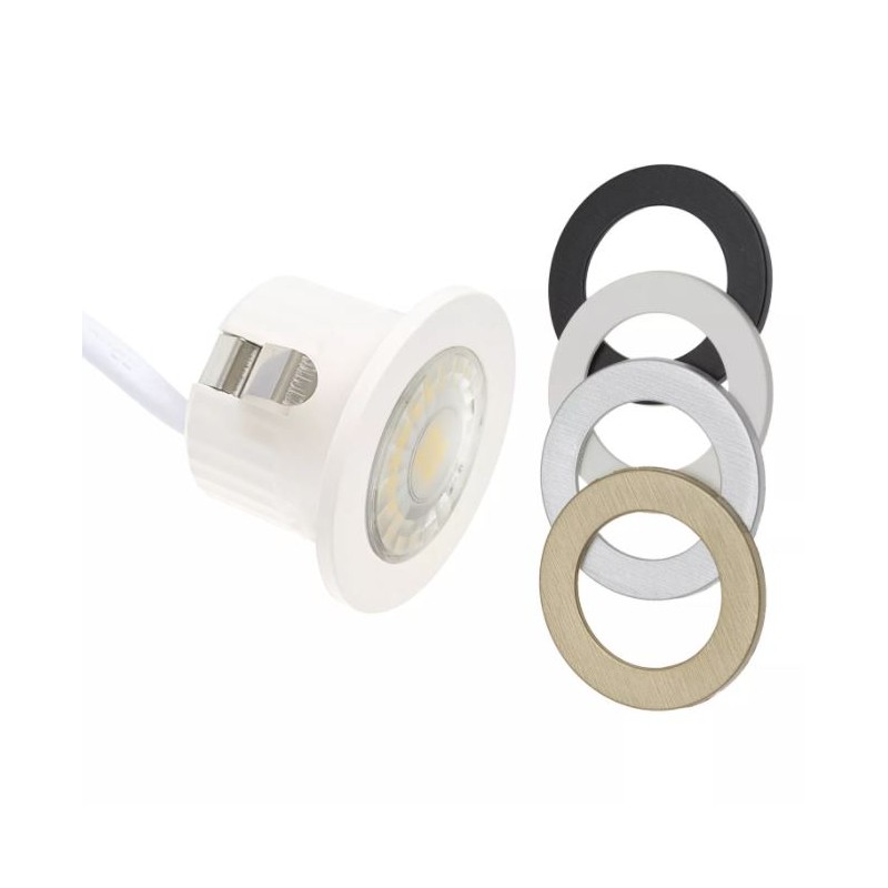 Miniaturní zápustné LED svítidlo s čirým krytem, kde součásti balení jsou 4 vyměnitelné kroužky v barvách bílá, černá, stříbrná a mosaz. Je díky své velikosti vhodné k osvětlení polic, vitrín, nábytku atd.